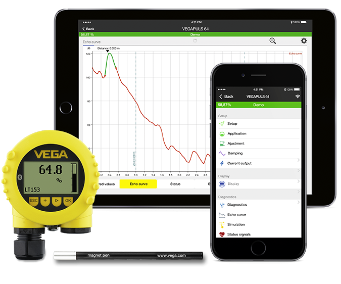 Všechny funkce pro zobrazení aktuální hodnoty a nastavení jsou integrovány do aplikace VEGA Tools, která je zdarma k dispozici pro Android a iOS. Struktura menu aplikace VEGA Tools je shodná s aplikací PACTware/DTM pro PC.